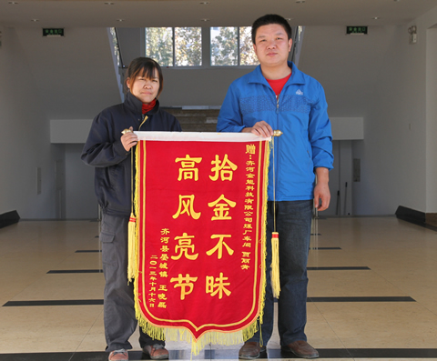 10月17日一大早,家住晏城鎮的村民王曉磊將一面繡有“拾金不昧,高風亮節”的錦旗送至金能公司,感謝公司員工賈麗青的拾金不昧。
