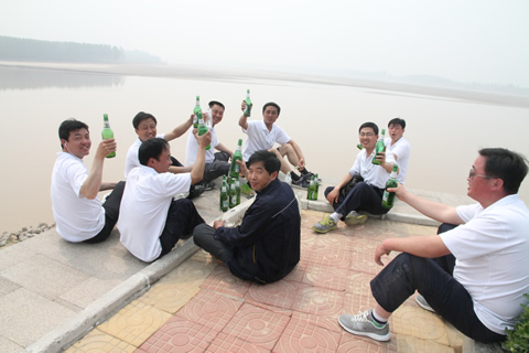 黃河岸畔,頓時熱鬧起來,面對滾滾東去的黃河,有的奔跑著,高聲呼喊:“黃河,我們來了”,有的走下大壩,去親近她,雙手掬起黃河水,指間濾下的,是滿手的沙。有的取出相機,記下美好瞬間,因天氣而略顯模糊,但黃河的博大開闊盡收眼底。樹蔭下,草地上,黃河邊,大家席地而坐,吃著,喝著,唱著,跳著,把酒臨風,開懷暢飲,歡聲笑語在黃河上空盤旋飛揚。