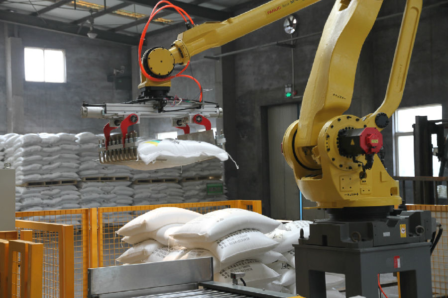 日前,公司投資60余萬(wàn)元從日本進(jìn)口了機(jī)械手,配套新上了整平機(jī)、皮帶及電子秤糾錯(cuò)系統(tǒng),用以硫酸銨的搬運(yùn)打垛,現(xiàn)運(yùn)行良好。投用后,大大降低了員工勞動(dòng)強(qiáng)度,可減少操作人員6個(gè)(圖為機(jī)械手工作場(chǎng)景)。