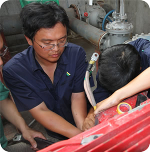 15:30,張益超與筆者交流時,他的手機響了,“消防水泵跳閘了,你來一下吧”,張益超說了句不好意思,拿著工具就走了。這時恰巧電儀組的工程師周冬青進來了,我說明了想去現場看一下工作的張益超時,他欣然同意,帶我們前去的路上,說起張益超時,周工打開了話匣子,如數家珍:“小伙子來公司時間不長,但好學肯干,干活不惜力氣,先后參與了甲醇項目35KV、10KV變電系統的安裝調試,對甲醇項目的電力系統十分熟悉,是這個年齡段中不可多得的,也是進步較快的”,來到消防水泵房,張益超正忙著查找故障點,不便多聊,我便離開了。