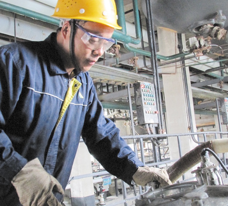 去對甲酚車間了解張劃之時,已是初秋時節。見到張劃之,黃色安全帽下的頭發濕了,上衣透了。“剛上班15分鐘,天也不是那么熱了,別人衣服是干的,為什么獨他是濕的”,這讓我很詫異,同行的人告訴我,“他接過班就一直忙,一邊協調母液裝車,一邊協助機修更換減速機軸承,兩邊跑,這也是他日常工作的真實寫照”。