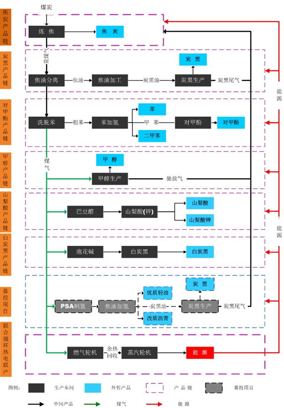 公司集煉焦和化產(chǎn)、煤焦油深加工和炭黑生產(chǎn)、苯加氫和對甲基苯酚生產(chǎn)、泡花堿和白炭黑生產(chǎn)、山梨酸及山梨酸鉀生產(chǎn)、焦爐煤氣制甲醇、燃氣輪機聯(lián)合循環(huán)熱電聯(lián)產(chǎn)等業(yè)務(wù)于一體,主要產(chǎn)品包括焦炭、炭黑、白炭黑、山梨酸及山梨酸鉀、對甲基苯酚等,下游涉及鋼鐵、輪胎、塑料、化纖、醫(yī)藥、食品等行業(yè)。